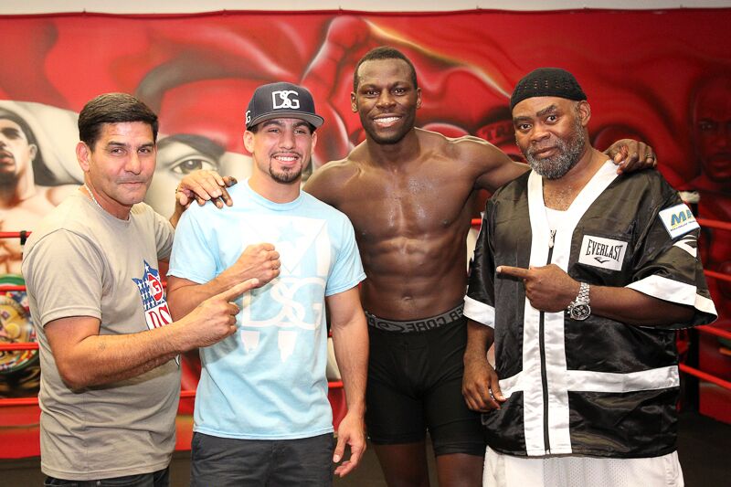 (From left to right) Angel Garcia, Danny Garcia, Steve Cunningham and Naazim Richardson pose together at the DSG Boxing Club in Philadelphia on Wednesday, July 22. Photo Credit: Ed Diller