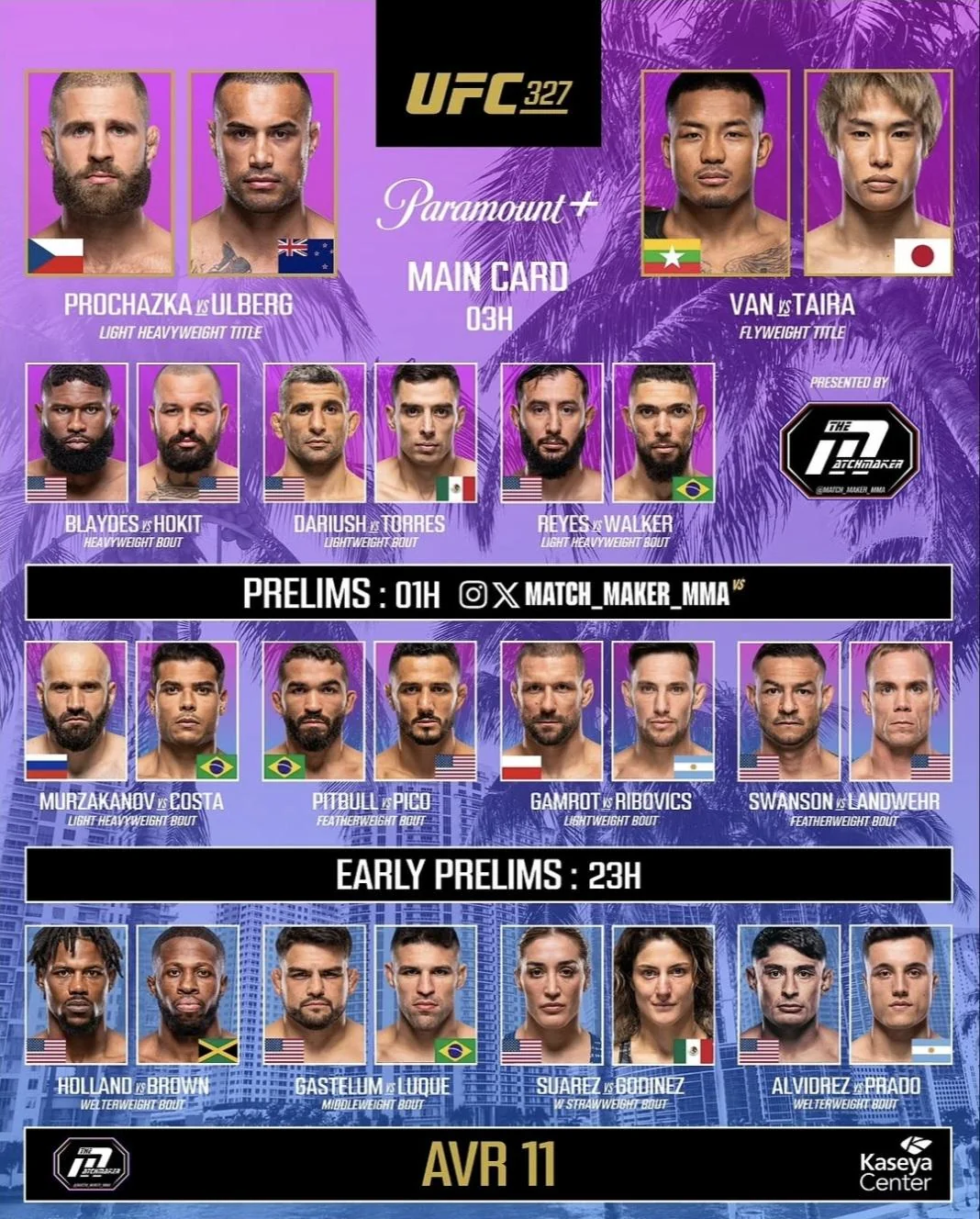 UFC 327 WEIGH-IN VIDEO, PRESS CONFERENCE, BETTING ODDS & COUNTDOWN SHOW Miami, Florida (April 10th, 2026)– UFC 327 is set for Saturday, April 11, 2026, live from the Kaseya Center in Miami, Florida. In a major shift for the promotion, this event will be available to stream exclusively on Paramount+, marking the end of the […]