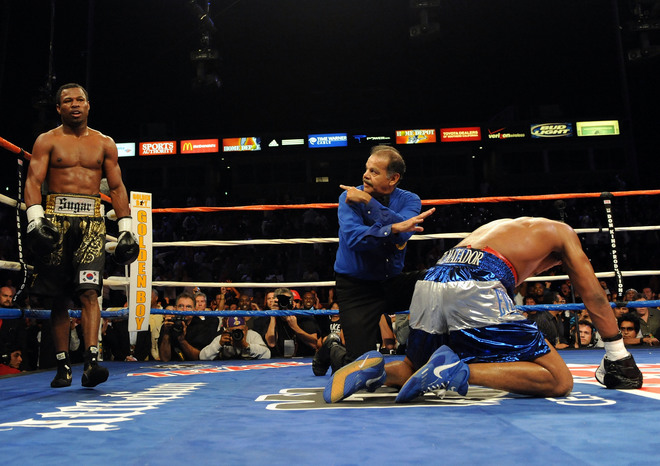 CARSON, CA – SEPTEMBER 27: Shane Mosley waits in the corner as the referee gives a ten count to Ricardo Mayorga of Nicaragua in the 12th round during their junior middleweight bout at the Home Depot Center on September 27, 2008 in Carson, California. (Photo by Harry How/Getty Images)