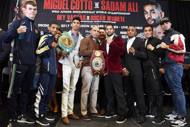 NEW YORK CITY (NOV. 30, 2017) Four division world champion Miguel Cotto (41-5, 33 KOs) and current WBA International Welterweight Champion Sadam “World Kid” Ali (25-1, 14 KOs) today hosted the final press conference for their WBO World Junior Middleweight Championship fight, which takes place Saturday, Dec. 2 at the World’s Most Famous Arena, Madison Square Garden, and will be televised live on HBO World Championship Boxing beginning at 10:00 p.m. ET/PT.Joining Cotto and Ali at the final press conference were undercard fighters including WBC World Super Bantamweight Champion Rey Vargas (30-0, 22 KOs) and NABF Bantamweight Champion Oscar “El Jaguar” Negrete (17-0, 7 KOs), who will fight for Vargas’s belt in the HBO-televised co-main event. They were also joined by featherweight contender Ronny Rios (28-2, 13 KOs), super lightweight contender Zachary “Zungry” Ochoa (17-1, 7 KOs), junior flyweight contender Angel “Tito” Acosta (16-1, 16 KOs), and Aaron “Silencer” McKenna, Ireland’s no. 1 ranked amateur fighter who will make his professional debut under the Golden Boy Promotions banner on Saturday.Here are what the fighters, their teams, and promoters had to say at today’s final press conference at Madison Square Garden:MIGUEL COTTO, FOUR DIVISION WORLD CHAMPION:“It’s been a pleasure for me to try to entertain you guys for 17 years. I have done my best at every opportunity for the benefit of my family. They mean everything to me and I am so proud of them and they are so proud of me.