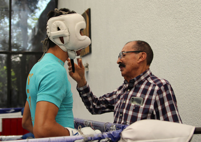 (ABOVE: Rey Vargas receives instructions from renowned trainer Ignacio “Nacho” Beristain during a sparring session at Romanza Gym ahead of his fight against Azat Hovhannisyan on May 12 and televised live on HBO World Championship Boxing)