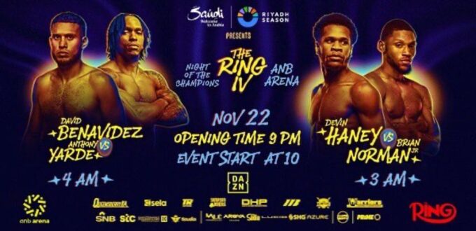 BENAVIDEZ VS. YARDE & HANEY VS. NORMAN JR. WEIGH-IN, PRESSER, BETTING ODDS, MEDIA WORKOUT & PREVIEW The Ring IV DAZN Night of Champions! ANB Arena Eight Bout Riyadh Season Preview Sign up to DAZN to see this Historic Card! By Robert Brizel, Head Real Combat Media Boxing Correspondent Riyadh, Saudi Arabia (November 21st, 2025)-– The feature bout between […]