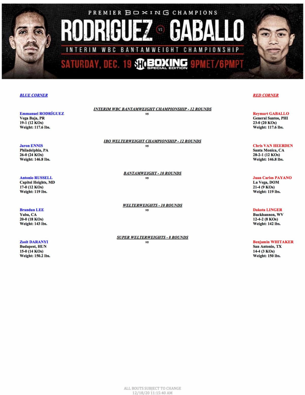 Click HERE for PDF Version Click HERE for Photos from Amanda Westcott/SHOWTIME EMMANUEL RODRIGUEZ VS. REYMART GABALLO FIGHT WEEK QUOTES Quotes from Rodriguez, Gaballo, Jaron Ennis, Chris van Heerden, Antonio Russell and Juan Carlos Payano Former World Champion Rodriguez Battles Unbeaten Gaballo Saturday, December 19 Live on SHOWTIME® (9 p.m. ET/6 p.m. PT) NEW YORK – December […]